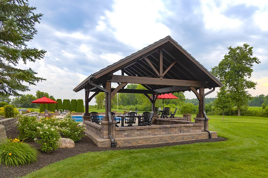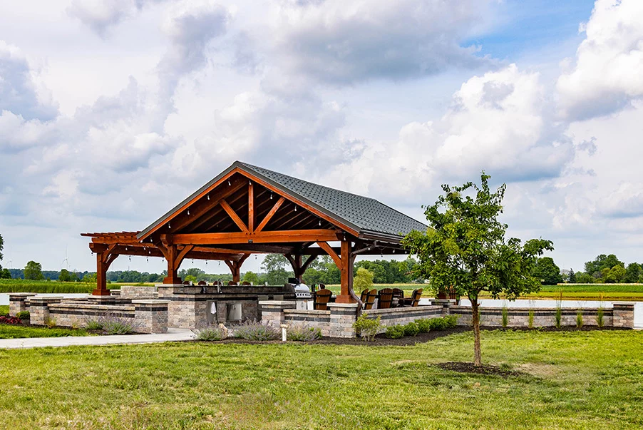 A timber frame pavilion expands the options for outdoor entertaining. For example, timber frame pavilions pair perfectly with outdoor kitchens. And since our timber frame pavilions can be custom-made to fit existing patios, you don’t have to deal with the hassle of laying a new patio.