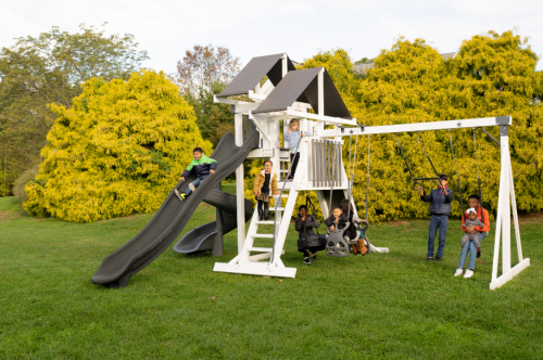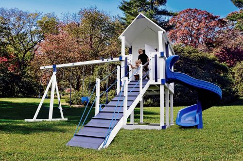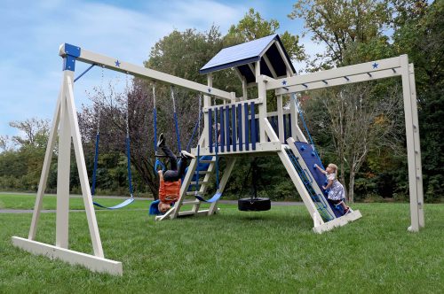 Every single one of the Star Tower vinyl swing sets features a full tower with a roof, complete with at least one slide. Some of the larger sets in this family feature multiple slides, rock walls, gangplanks and more. Although this line packs a ton of excitement, it is still quite affordable as well!