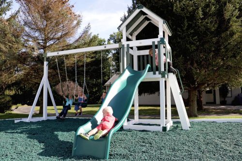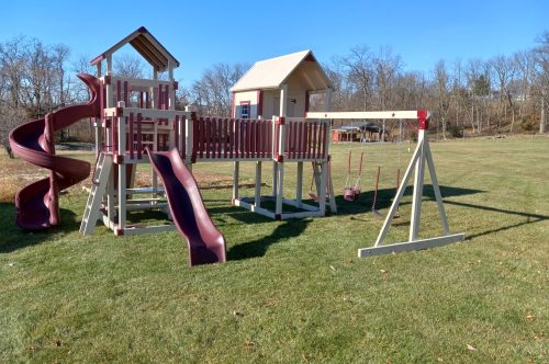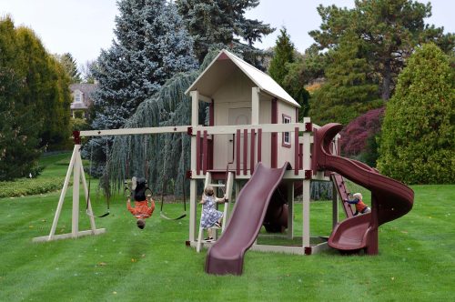 These simple but super-fun kids’ vinyl swing sets are the best budget option! All of these sets feature a sturdy swing beam for hours upon hours of fun. On top of that, several of the Star Gazer sets have a small open tower with slides and climbing options!